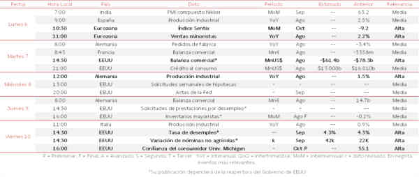 En el comienzo de la agenda de la semana destacará la publicación del índice Sentix de la confianza de los inversores de la Eurozona de octubre (vs -9,2 puntos septiembre), que contribuirá a medir el sentimiento de los inversores en el arranque del 4T en un contexto enmarcado por el momentum económico de Francia y Alemania. Paralelamente, en el bloque monetario europeo se conocerá la evolución de las ventas minoristas en agosto (vs. +2,2% interanual julio), clave para determinar la tendencia del consumo de los hogares europeos durante la campaña estival.