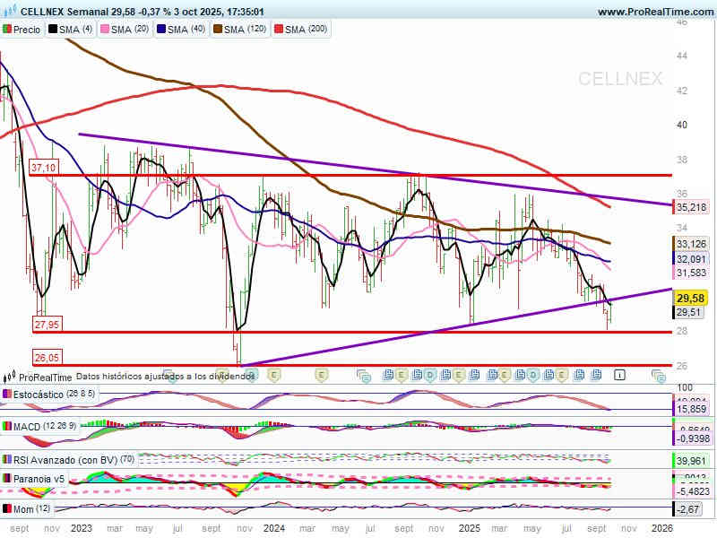 Velas semanales, perdiendo el apoyo relevante de la directriz alcista de l/p y en busca de la próxima zona de soporte situada en torno a los 28€.