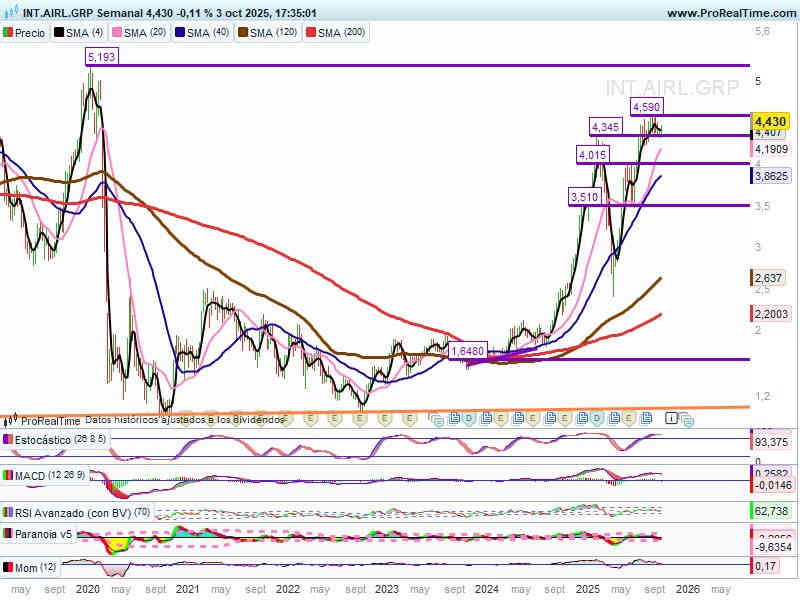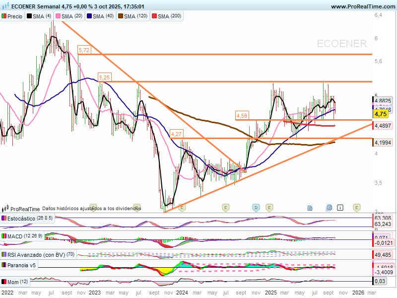 En semanal, intenta no perder la zona de soporte de los 4,60€ mientras realiza apoyo en SMA de 40 sesiones.
