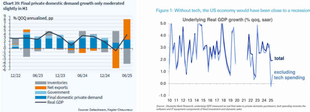 A la espera del dato de creación de empleo (pospuesto por el cierre del gobierno federal), otras referencias recientes, encuestas incluidas apuntan a cierto estancamiento, con afectación sectorial amplia. Mercado laboral que, sin ser terrible, se modera. Con la extensión de la IA, algunos empiezan a preguntarse hasta qué punto podemos tener una economía que resiste con un empleo que se deteriora, lo que complicaría mucho distintas políticas económicas, monetarias…