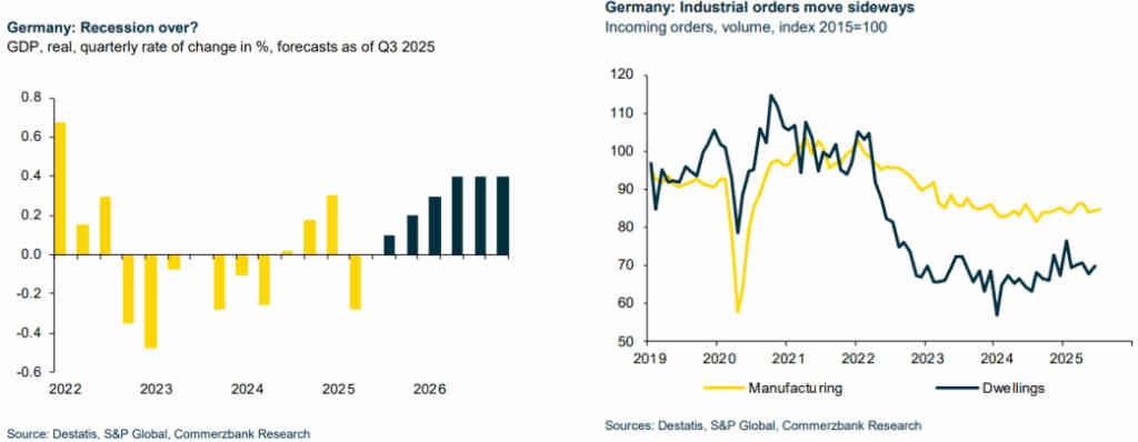 Alemania venía creciendo por debajo de la media europea y se espera que crezca en 2026 un 1,1% según consenso de mercado, en un contexto donde los planes fiscales ganan protagonismo (mayor gasto en defensa, infraestructuras, transición energética…). A pesar de que los indicadores de sentimiento manufactureros han mejorado algo recientemente, todavía no se ha visto reflejado en los datos reales.