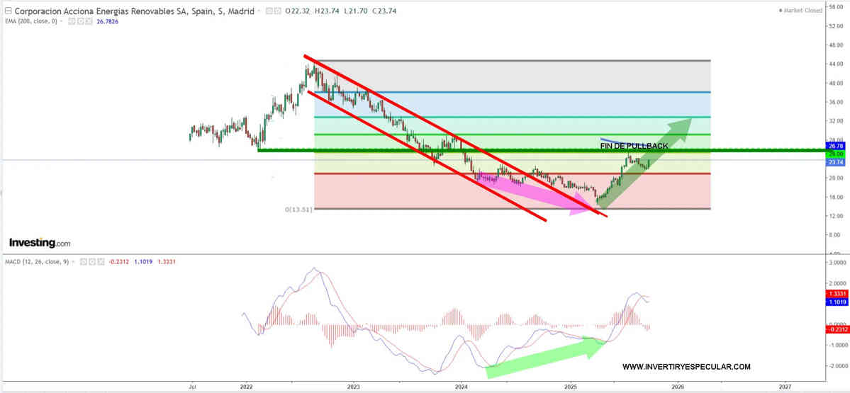 La brutal eyección alcista de Solaria es una muestra que el mercado vuelve a tener apetito inversor por las renovables, Grenergy por ejemplo está en máximos históricos/subida libre y a Acciona Energía le damos objetivo 32 euros si es capaz de superar la EMA 200 porque el pullback ya lo hizo y si supera máximos precedentes ya no es para hacer esa pauta sino para ascender al 61,8%.