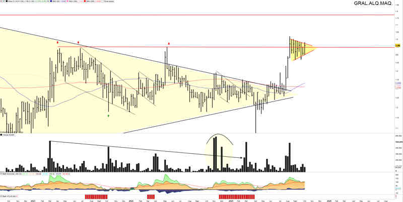 Pero lo que vemos en el gráfico semanal es sin duda un banderín alcista, patrón de continuidad ante zona resistencia clave 1,55€.