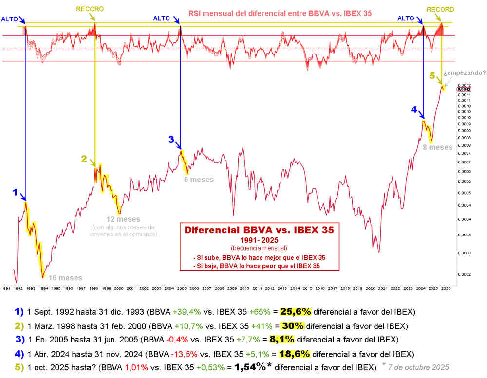En el gráfico inferior estudiamos el relativo entre el BBVA y el índice español, resaltando una situación excedida en sus indicadores mensuales. Desde el año 1991, sólo en cinco ocasiones se han visto lecturas tan elevadas, siendo la actual muy similar al máximo exceso que se produjo en el año 1998.