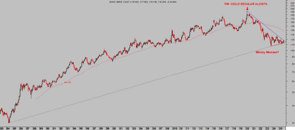 Si la deuda americana rebasa los niveles máximos de rentabilidad alcanzados meses atrás será sinónimo de que las referencias técnicas de precios serán perforadas y observando la configuración de las pautas la ruptura puede desencadenar nervios, muchas ventas y un rápido tramo a la baja, ¿Momento Minsky?. En tal caso la FED se vería forzada a salir al rescate con programas de expansión del balance (QE o quantitative easing) para comprar bonos del Tesoro (Juan Palomo).