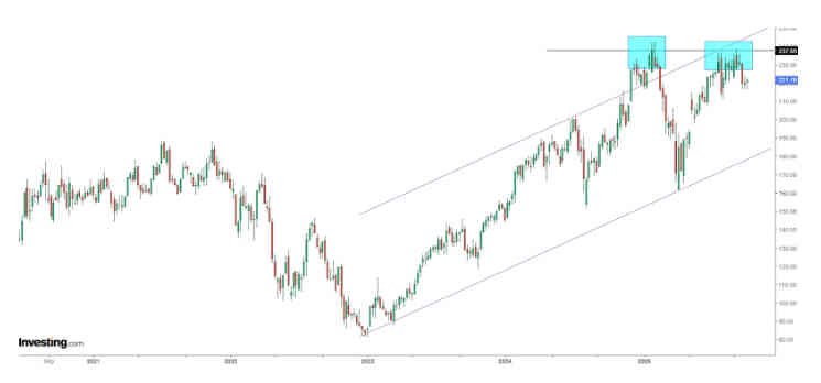 Técnico: en su primer intento por romper el canal alcista por su parte alta no pudo.