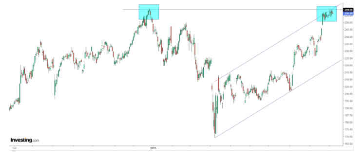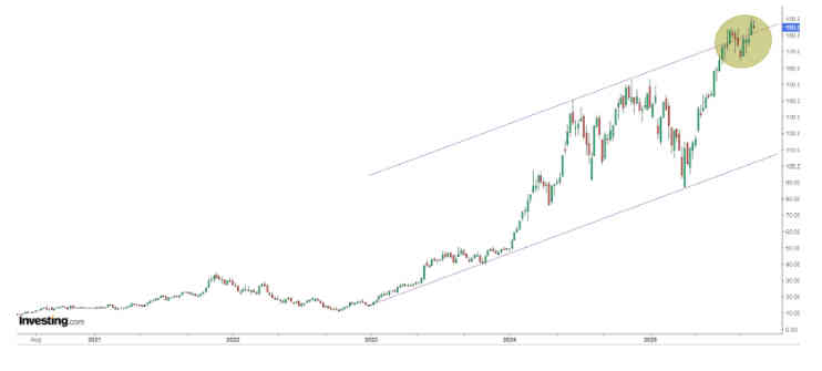Técnico: está en máximos e intentando salir del rango de su canal tendencial alcista.