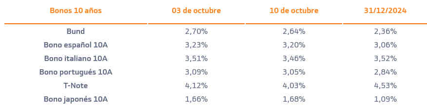 Trump amenazó el viernes con imponer aranceles del 100% a China y los bonos se compraron de forma generalizada en un movimiento de risk-off. Mientras tanto, la administración continúa cerrada y por ello el IPC (sept.) se publicará el 24 octubre en lugar de esta semana.