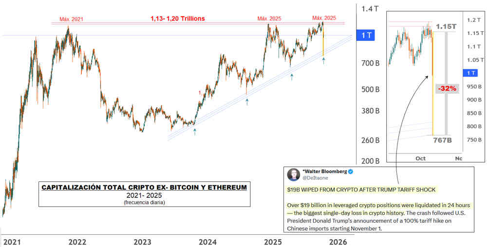 Aunque las principales criptomonedas (BITCOIN, ETHER y SOLANA) cayeron entre un 10- 20%, otras de las principales 50 monedas llegaron a caer más de un 80% de su precio, recuperando gran parte de la caída horas después. Como podemos ver en el gráfico inferior, la capitalización del mercado cripto, excluyendo el Bitcoin y el Ethereum, pasó de un máximo de 1,15T hasta 767B, llegando a caer un 32%, recuperando gran parte poco después.