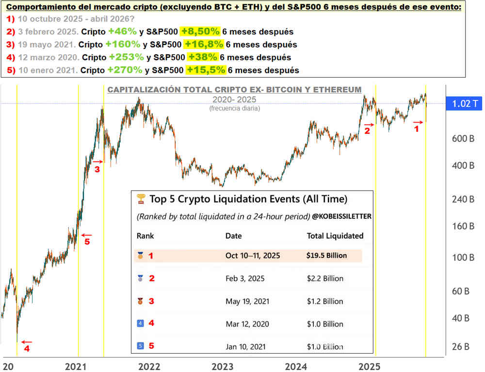El pasado viernes, pasando desapercibido con el mercado cerrado (SP500 -2,7%), se produjo un histórico evento aciago en el mercado de las criptomonedas. Tras el cierre de la bolsa americana, el presidente Trump anunciaba aranceles del 100% para China, provocando un evento masivo de liquidaciones en cascada en las criptomonedas. Se estima que esa noche se liquidaron, al menos, 19.000 millones de dólares en posiciones apalancadas, siendo el peor evento de liquidación de la historia de este mercado, nueve veces más que el siguiente, el pasado 3 de febrero.
