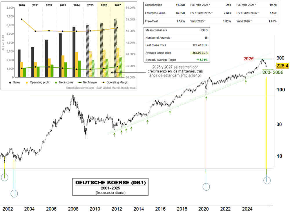 Desde los máximos del pasado mayo, en 292 euros, hasta los mínimos del pasado 24 de septiembre Deutsche Boerse acumula un 25% de caída, acercándose a zonas claves de tendencia alcista de largo plazo.