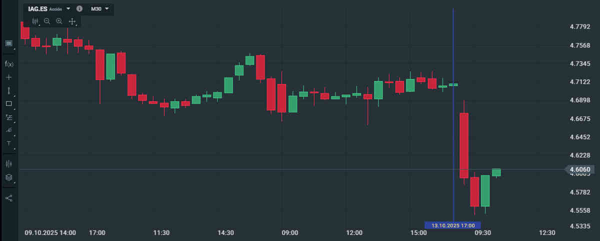 El farolillo rojo del Ibex35 en el día de hoy es IAG (IAG1:MC), con una caída del 2,86% hasta los 4,57 euros por acción. La aerolínea española sufre debido a los últimos informes sobre datos operativos en un contexto de precios menos favorables.