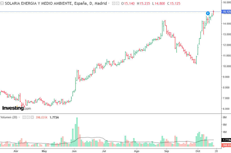 Esta cota se sitúa a un 14% de incremento de los niveles actuales. En el acumulado del año el precio por acción de Solaria se revaloriza un 73%.