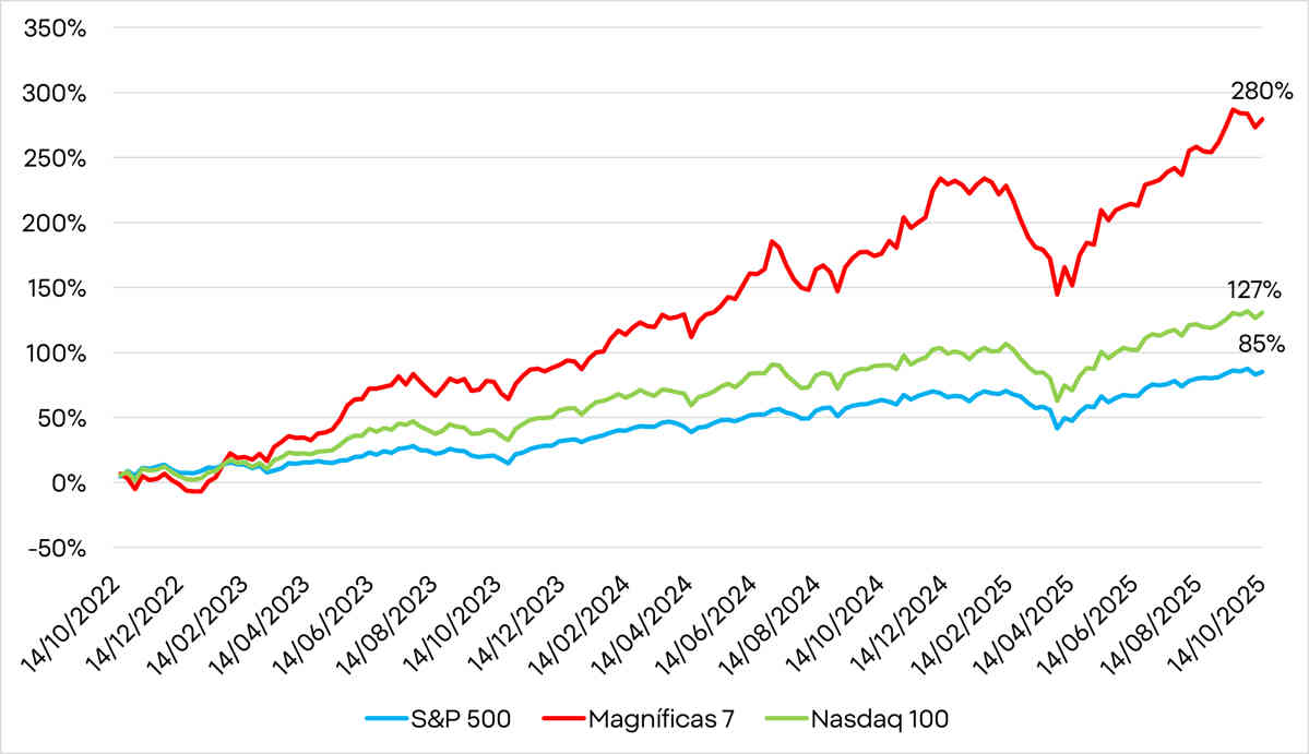 Desde entonces, acumula una subida del 85%, mientras que las Siete Magníficas han hecho un 280%. En los últimos doce meses, el índice ha avanzado un 15%, el doble del promedio habitual en el tercer año de un mercado alcista. Los inversores, fascinados pero inquietos, se preguntan si estamos ante una revolución tecnológica o la antesala de una nueva burbuja financiera.