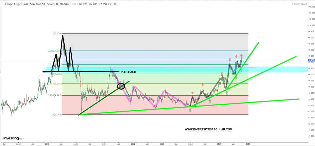 Como veis desde el 2024 por el lado técnico Grupo San José (GSJ:MC) tiene una sucesión de máximos y mínimos ascendentes sin llamar mucho la atención pero recuperando retrocesos de Fibonacci uno tras otro y superado el 61,8% a por el 78,6% y luego terminar la vuelta alcista a los máximos del 2019.