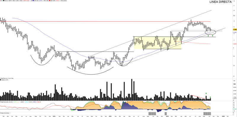 1,26€. El valor se encuentra en zonas tendenciales clave, pues tenemos a la directriz alcista y la media de 50 semanas que viene haciendo de soporte estos últimos años.
