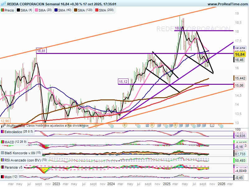Velas semanales. Precio actual se encuentra en alcance de la SMA40 sesiones y zona de resistencia de los 16,80€.