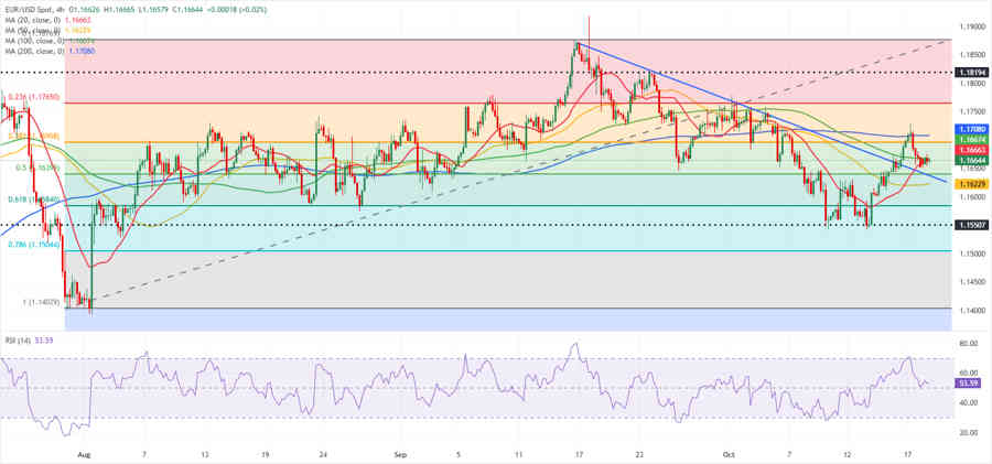 El EURUSD cotiza entre las medias móviles simples (SMA) de 50 días y 100 días, mientras que el indicador del Índice de Fuerza Relativa (RSI) en el gráfico de 4 horas se mantiene cerca de 50, reflejando una postura neutral.