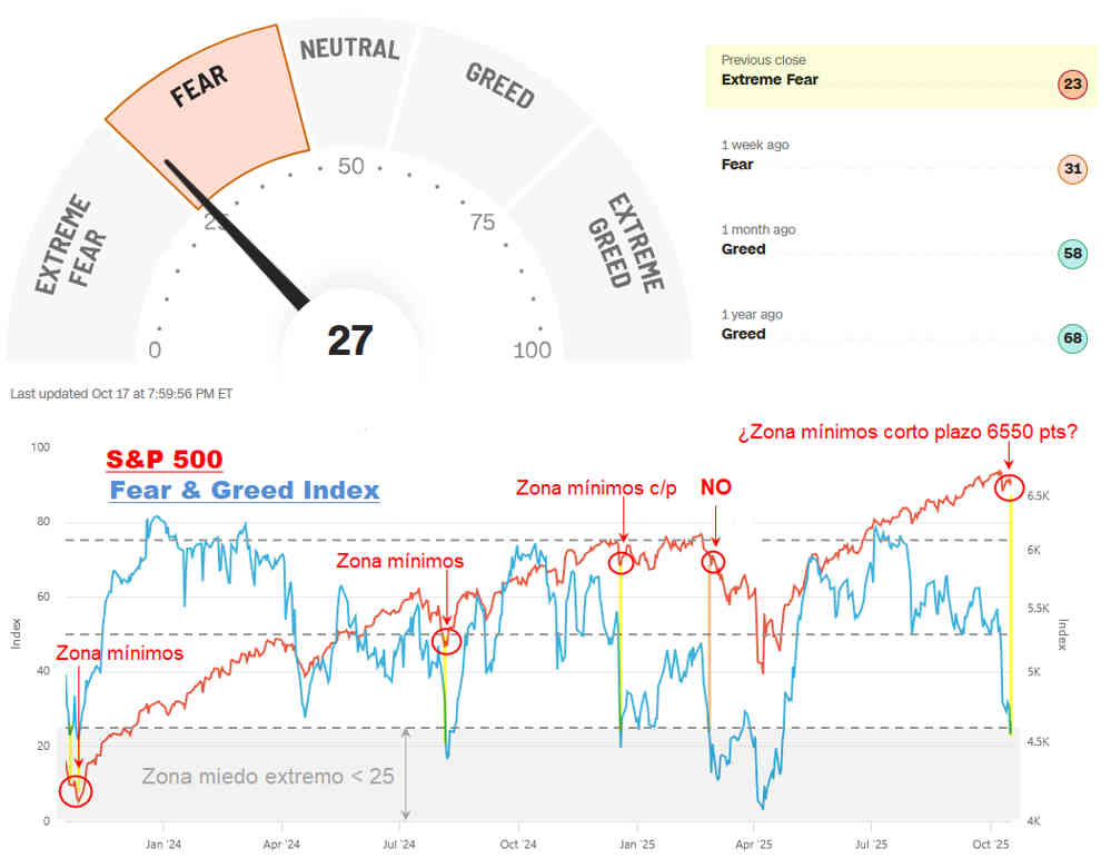 En el gráfico inferior se aprecia cómo cuando este indicador se adentra en terreno de miedo extremo, un suelo en el índice tiende a estar cercano, salvo que la corrección que se haya iniciado sea de grado mayor (por ejemplo en la corrección iniciada en febrero 2025, cuando las lecturas en miedo extremo se mantuvieron más tiempo).