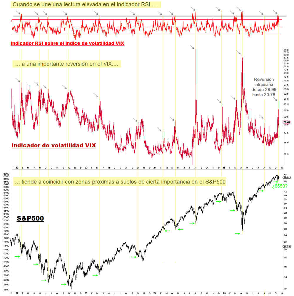 En un sentido muy parecido tendríamos la información que nos muestra el índice de volatilidad del SP500 (VIX). En el gráfico inferior se aprecia cómo cuando el indicador sobre el índice de volatilidad (RSI) se encuentra en terreno históricamente elevado y al mismo tiempo se produce una importante reversión en el VIX (28.99 hasta 20.78 el pasado viernes), una zona cercana a un suelo de corto plazo tiende a estar cercana.