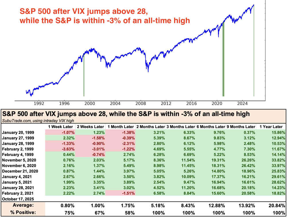 Profundizando en el dato anterior encontraríamos este estudio efectuado por el usuario de X @SubuTrade, que concluye que cuando se producen saltos de volatilidad en el VIX por encima de 28 (viernes alcanzó 28.99) y el SP500 se encuentra a un 3% de máximos históricos, el comportamiento del índice siempre ha tendido a ser positivo 2-3-6-9 y 12 meses después.