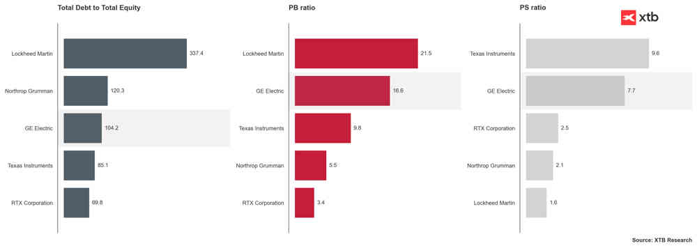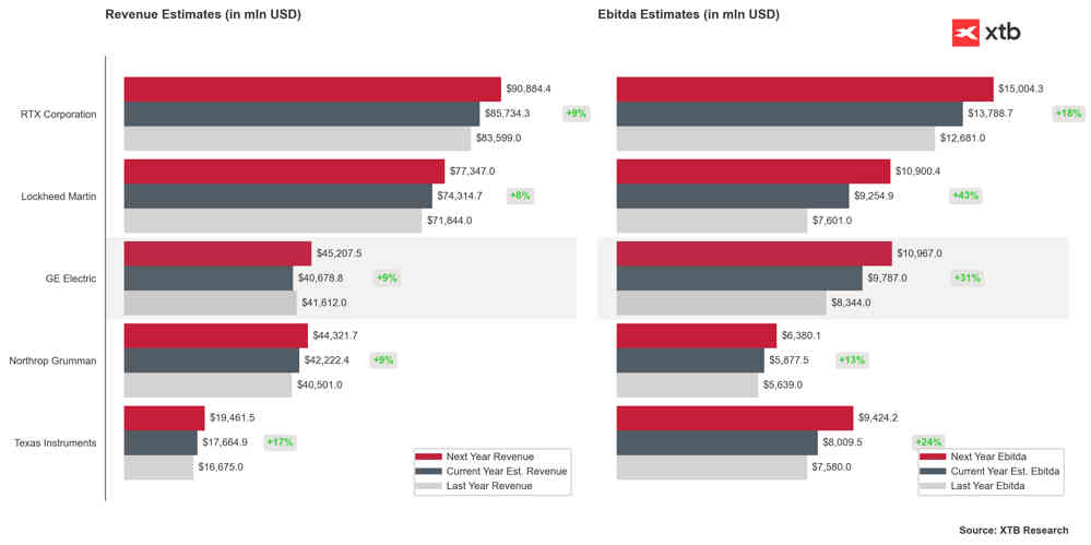 La demanda de los países de la OTAN, Oriente Medio y la región del Indopacífico se mantiene en niveles históricamente altos. GE Aerospace y RTX tienen una participación significativa en los segmentos civiles relacionados con la aviación comercial, mientras que Texas Instruments se dedica principalmente a la fabricación de componentes analógicos y semiconductores utilizados en electrónica industrial, automoción y sistemas de defensa, pero no depende de pedidos militares.