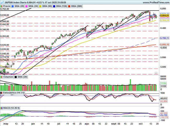 Todo sigue igual de momento , como soporte tiene el nivel de 6500/6550 puntos y como resistencia tiene el nivel de 6680 puntos, superar los máximo de la semana podrían impulsar al índice hacia 6760 que son máximo históricos.