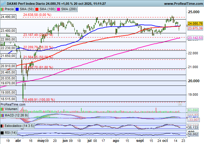 Este rango todavía no está definido y, actualmente, el DAX se encuentra equidistante de estas dos zonas de referencia clave. Cualquier superación de los máximos de las últimas semanas, por encima de los 24.770 puntos, abriría la puerta a nuevos avances y a la formación de un tramo alcista bastante interesante.
