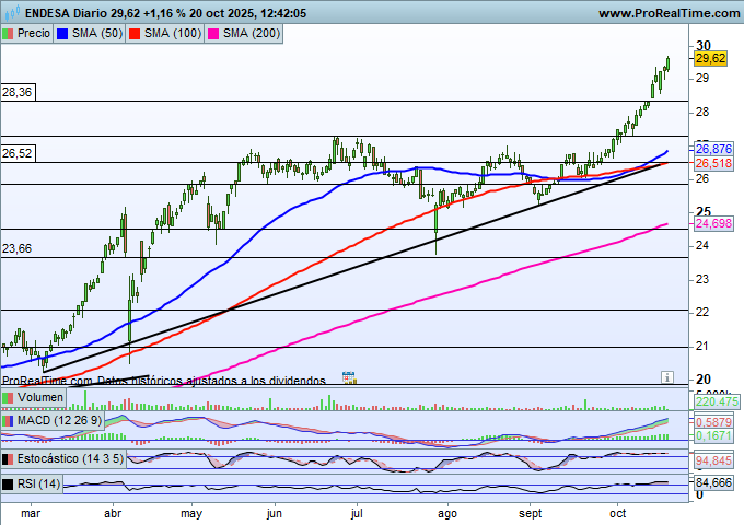 En cuanto a valores, destaca el comportamiento de los títulos de Endesa (ELE:MC), que continúan en su trayectoria técnica libre y absoluta en gráfico adaptado a dividendo y ampliación. En las últimas sesiones, el sector energético, tradicionalmente considerado refugio, está captando la atención de los inversores y empujando a todas estas compañías al alza.