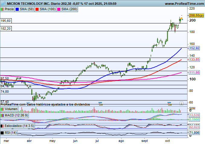 Actualmente, Micron Technology ha superado la zona de los 200 dólares por acción, entrando en su vida libre técnica y absoluta en gráfico adaptado a dividendo y ampliación. Se trata de uno de los valores más alcistas de la bolsa americana, con un escenario técnico positivo y un objetivo inicial cercano a los 222 dólares por acción.