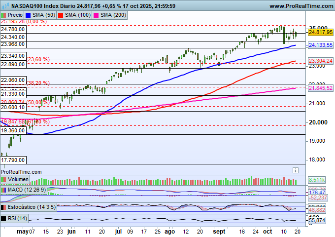 En lo que respecta al principal índice tecnológico, se observa un freno en la subida al filo de los 25.000 puntos, un nivel relevante tanto como resistencia técnica como psicológica.