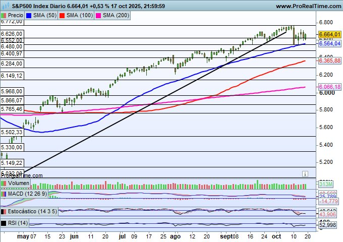 Es crucial que el SP500 no pierda la zona de los 6.570 puntos, un soporte relevante cuya pérdida podría llevar al índice hacia niveles notablemente inferiores. El buen aspecto técnico se mantiene vigente, reforzado por la reducción de la sobrecompra acumulada a corto y medio plazo.