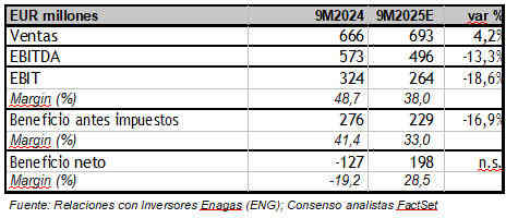 . ENAGAS (ENG) publicará hoy sus resultados correspondientes a los nueve primeros meses del ejercicio (9M2025). Adjuntamos a continuación las expectativas del consenso de FactSet, frente a los resultados de 9M2024: