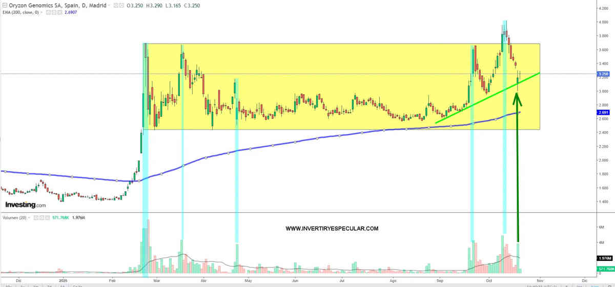 Observen que los picos de volumen que se producen por picos de máximos en precios luego suponen correcciones, es decir solo tiene el trasiego de negociación de una sesión recogen beneficios y hasta la próxima. Si nos ha gustado que tras la caída de ayer y pinchazo en la directriz alcista saliera volumen , si falla otra vez la acción se va a la EMA 200 bien por debajo de los 3 euros