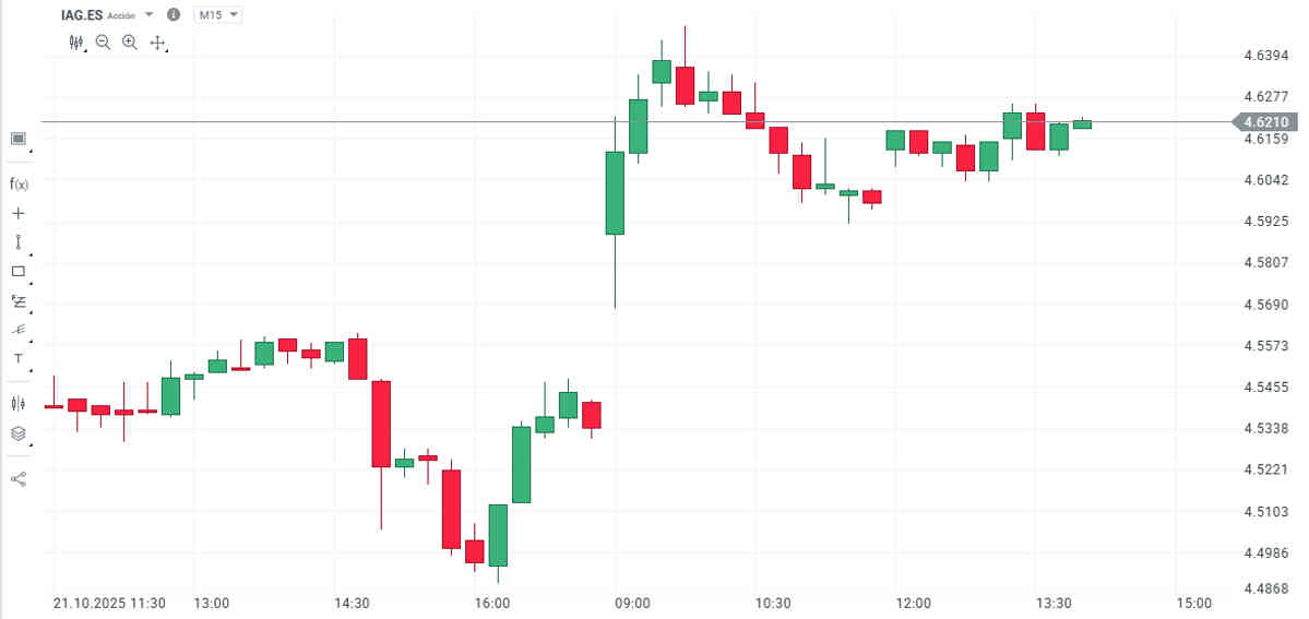 IAG presentará sus resultados del tercer trimestre el próximo 7 de noviembre. Desde su mínimo anual registrado el pasado 7 de abril, cuando su cotización bajó a los 2,45 euros, la firma ha rebotado un 87%. En el acumulado del año, además, las acciones de IAG firman una subida del 29%.