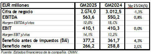 El beneficio neto de explotación (EBIT) se mantuvo en EUR 419,1 millones en el 9M2025, en línea (+0,0%) con la cifra obtenida en el 9M2024. En términos sobre la cifra de negocio, el margen EBIT cerró 9M2025 en el 14,1% (vs 13,9%; 9M2024)