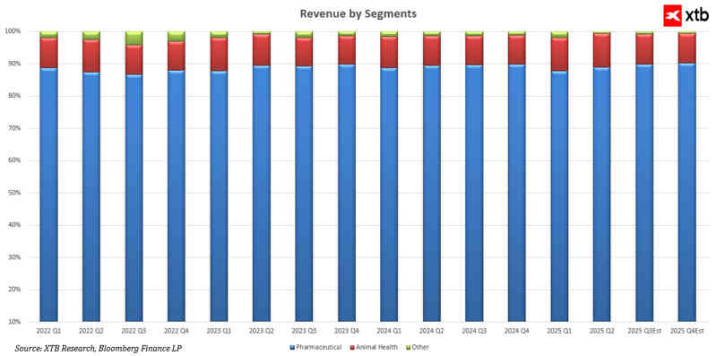 El segmento de salud animal, aunque más pequeño, sigue siendo un negocio estable y ligeramente creciente con ingresos trimestrales de entre 1.200 millones y 1.600 millones de dólares, lo que demuestra una diversificación efectiva de las fuentes de ingresos. El segmento «Otros» es el más pequeño y volátil, pero actúa como un negocio complementario que se adapta de forma flexible a las necesidades del mercado.
