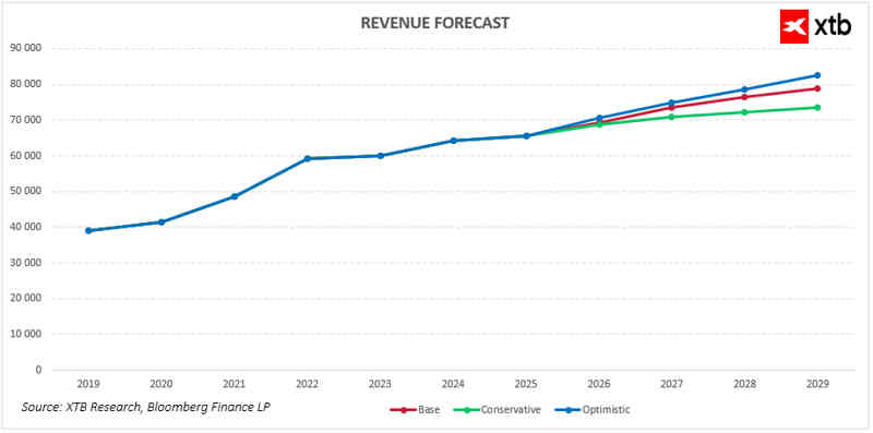 Escenario conservador: contempla mayores riesgos como la expiración de patentes clave, mayor competencia de genéricos y posibles desafíos regulatorios. El crecimiento de ingresos se ralentiza, alcanzando alrededor de 74.000 millones en 2029. Aun así, la compañía mantiene estabilidad financiera gracias a su diversificación y gestión eficiente de costos.