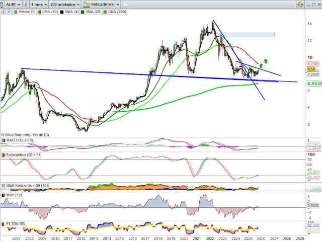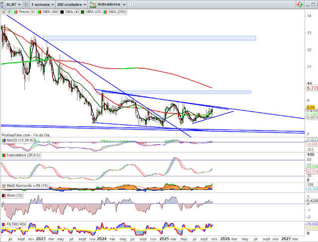 📌🟢Confirmando en la segunda vista de Alantra, en Gráfico Semanal, la rotura de los 8,70€, en actuales credenciales técnico / fundamentales, con indicadores en señal de compra ya, proyección estructural hacia objetivos zona 9,60€ y una vez confirme perforación de la importante Media Móvil 200 potencial proyección mayor hacia la zona de los 12,60€ / 12,90€.