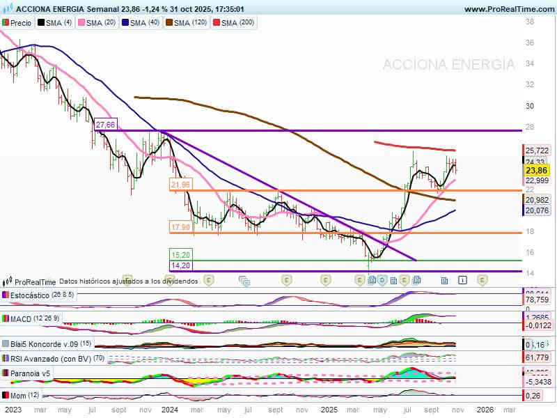 Velas semanales. Supera zona resistencia de 21,90€ e intenta alcanzar la SMA200 sesiones, los 25,70€.