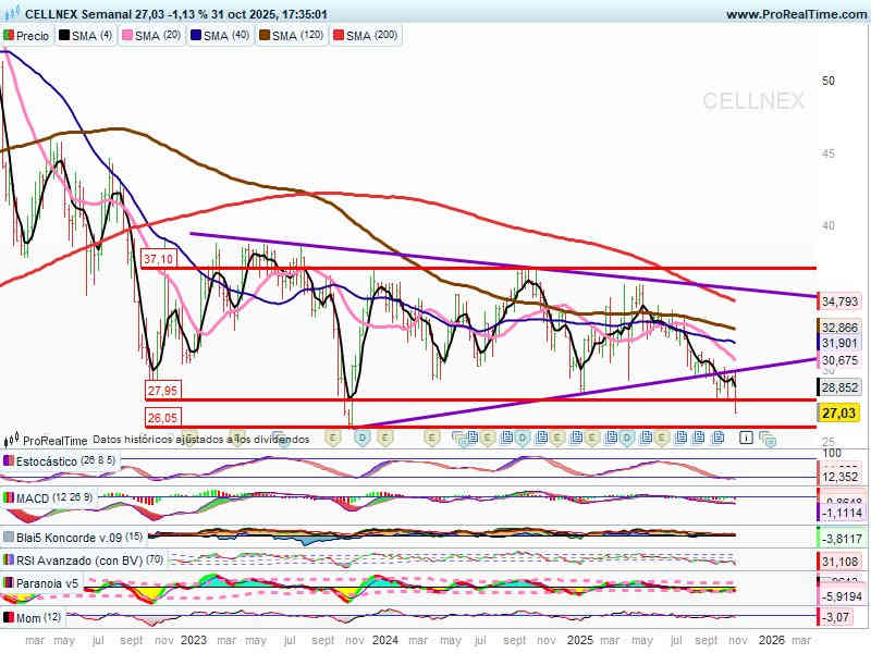 Velas semanales, perdiendo el apoyo relevante de la directriz alcista de l/p, alcanza y pierde la siguiente zona de soporte situada en torno a los 28€.