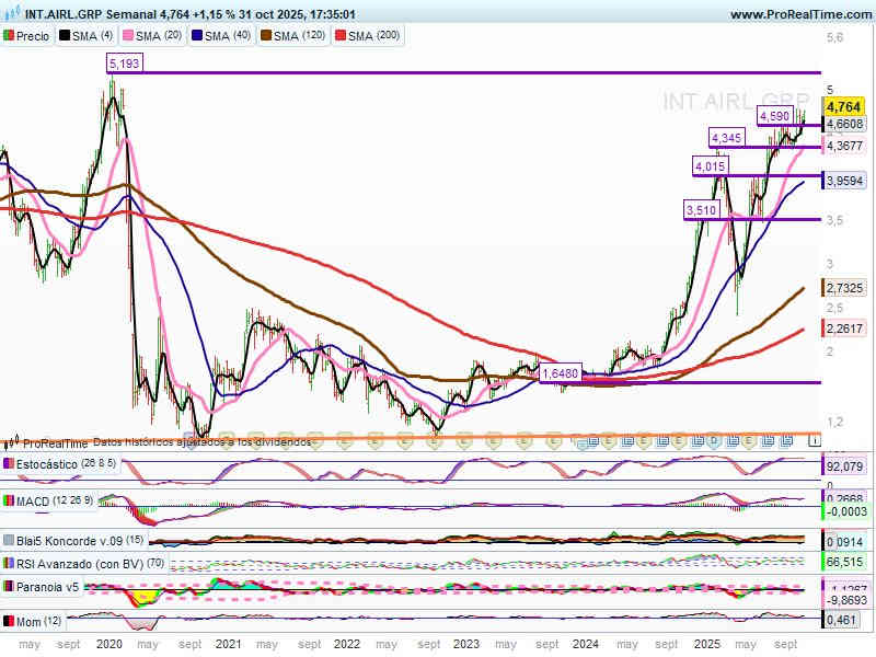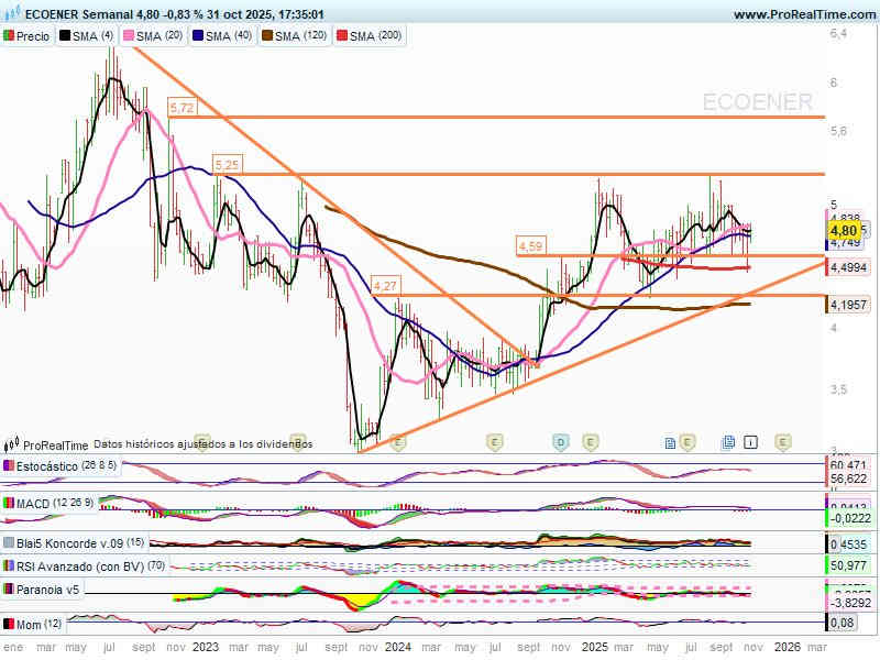 En semanal, intenta no perder la zona de soporte de los 4,60€, por donde pasa la SMA200 sesiones.