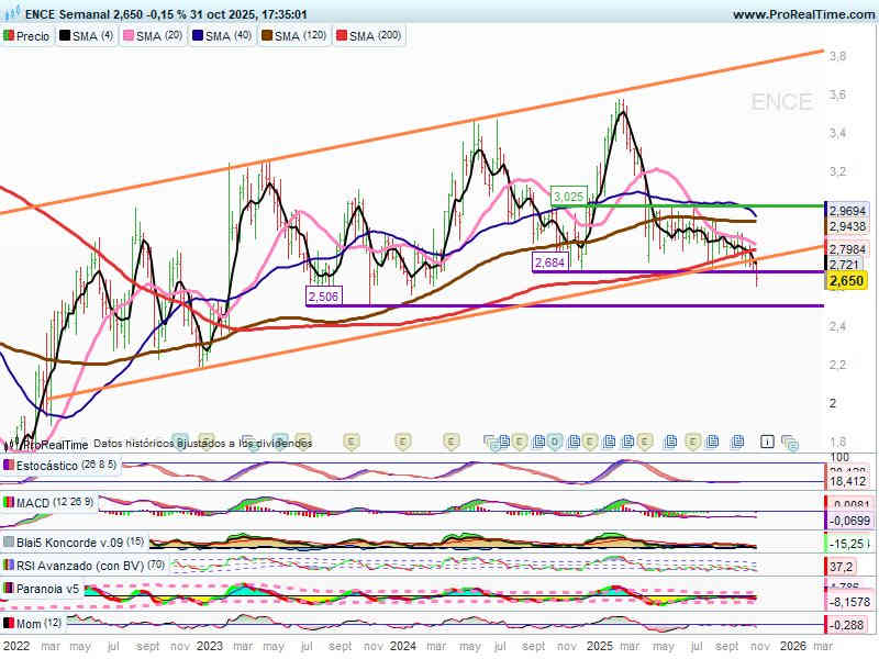 Velas semanales. Valor cuyo precio actual se encuentra en deterioro, pierde los niveles de la SMA200 sesiones, los niveles de la banda inferior del canal de l/p y el soporte de los 2,68€.