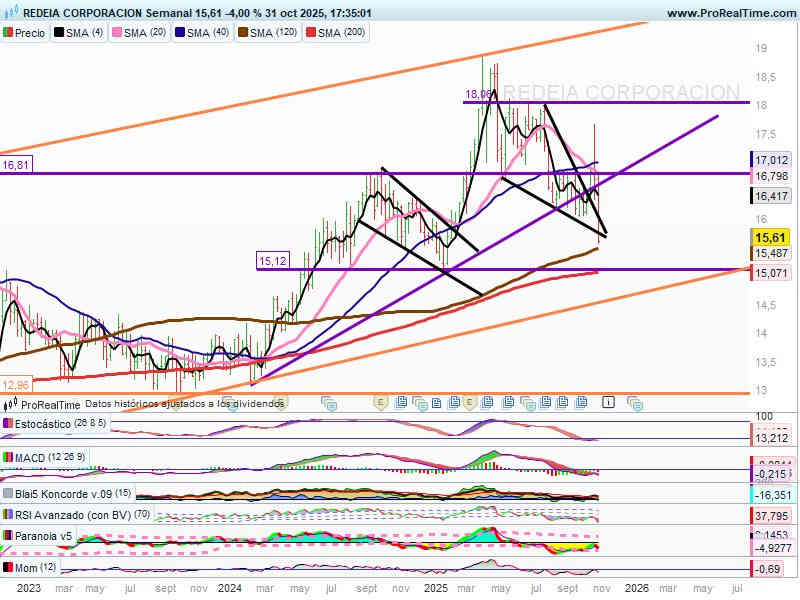 Velas semanales. Mucha volatilidad en estas últimas semanas. Precio actual se encuentra en alcance de la SMA120, los 15,50€ y la SMA200 sesiones, los 15€.