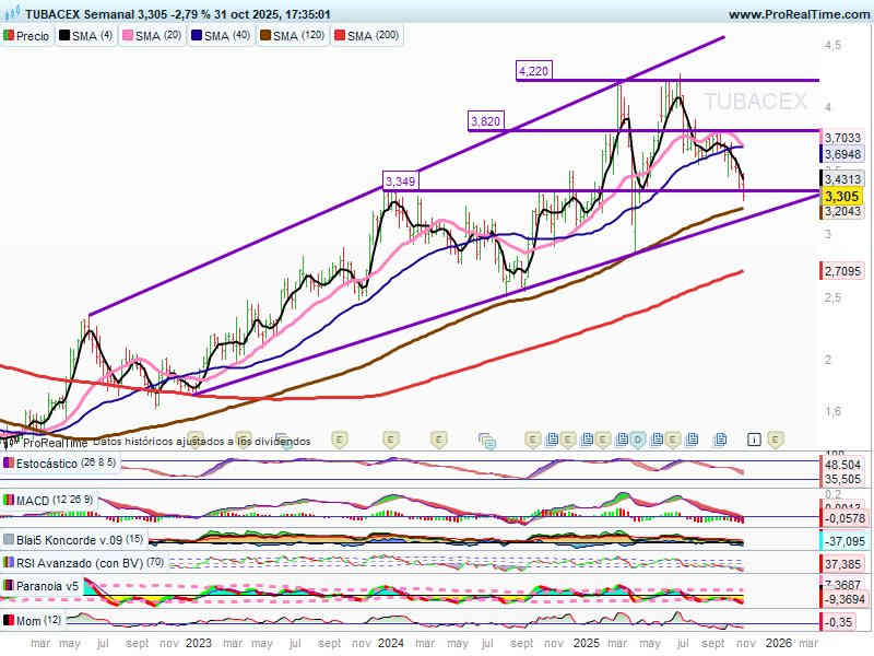 Sin descartar realizar nuevamente visita a la directriz alcista de l/p, por donde pasa la SMA 120 sesiones. Clave no perder los 3,20.