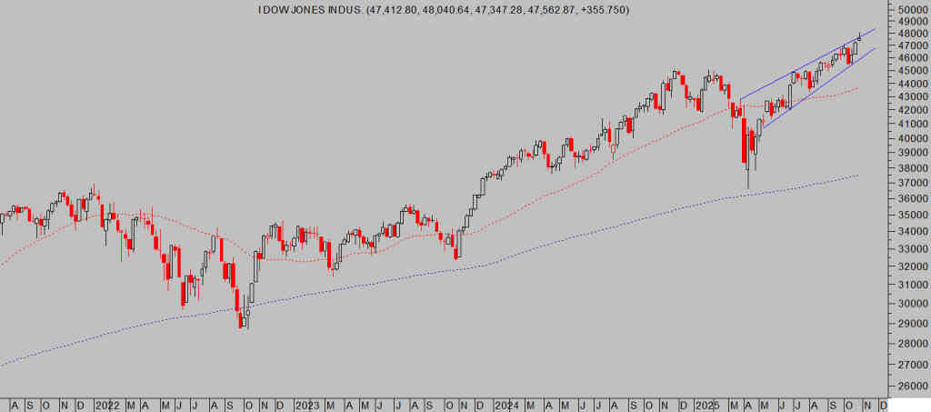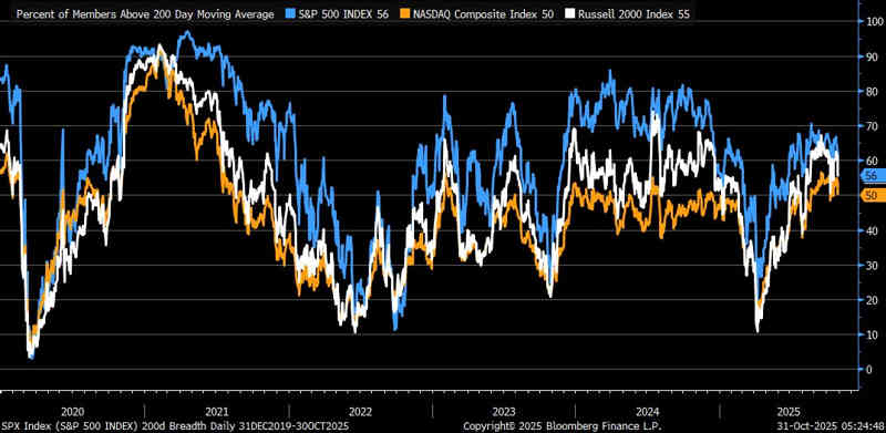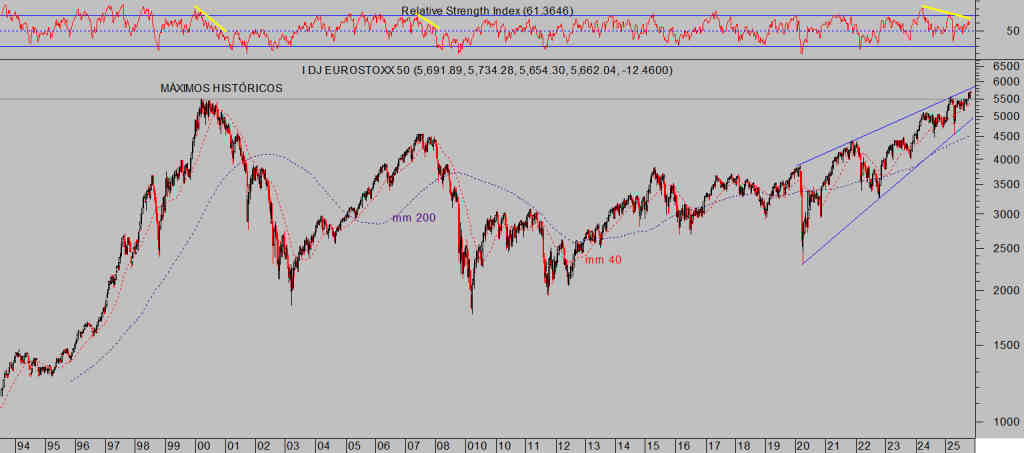 Las subidas se centran en pocos valores, responsables de la mayoría de la rentabilidad obtenida por los índices en los últimos años (hasta un 75% de las ganancias del SP500 en los últimos meses han sido proporcionadas exclusivamente por la tecnología orientada a IA), mientras que muchas acciones no acompañan ni confirman la fortaleza que se presupone a un mercado que ha subido más de un 50% en sólo 6 meses el Nasdaq o de un 40% el SP500.
