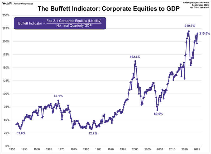 El Indicador Buffett está en 215%, un nivel muy superior al 162% de máximo registrado antes del pinchazo de la burbuja tecnológica del año 2000 y mucho más alto del nivel 100% que Buffett considera signo de sobrevaloración.