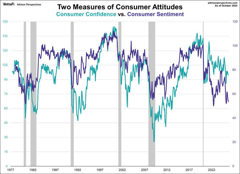 El principal motor de la economía es el consumo y su situación es verdaderamente frágil. Vean el sentimiento del consumidor según encuestas del Conference Board y de la Universidad de Michigan.