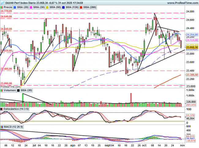 A muy corto plazo la tendencia es bajista en tanto que el SP500 no logre situarse de nuevo por encima de 6920 puntos, el escenario probable pasaría por una corrección objetivo 6740 puntos, zona que a su vez coincide con el GAP alcista del 23 de octubre.