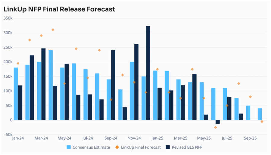 Sin embargo, según la agencia de empleo LinkUp la economía americana no generó empleos en octubre, más bien destruyó 5.000, aunque seguramente habrá que esperar al desbloqueo del shutdown para conocer la realidad (aunque una realidad siempre dudosa del Labor Department, que suele ofrecer cifras positivas en sus informes mensuales para después proceder con revisiones y recortes brutales tal como ha sucedido en 2024 y 2025).